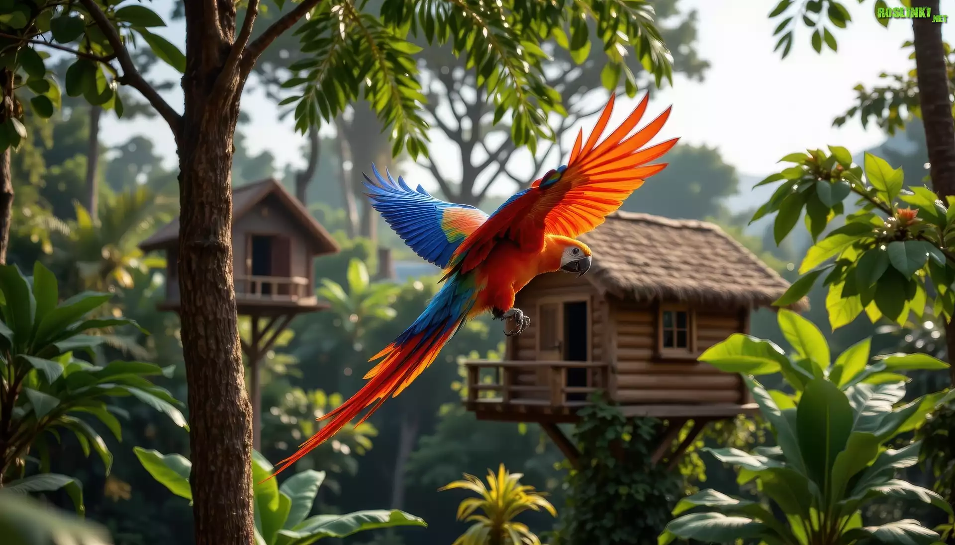 Rośliny: Papuga, Ara, Drzewa, Domki, Grafika AI