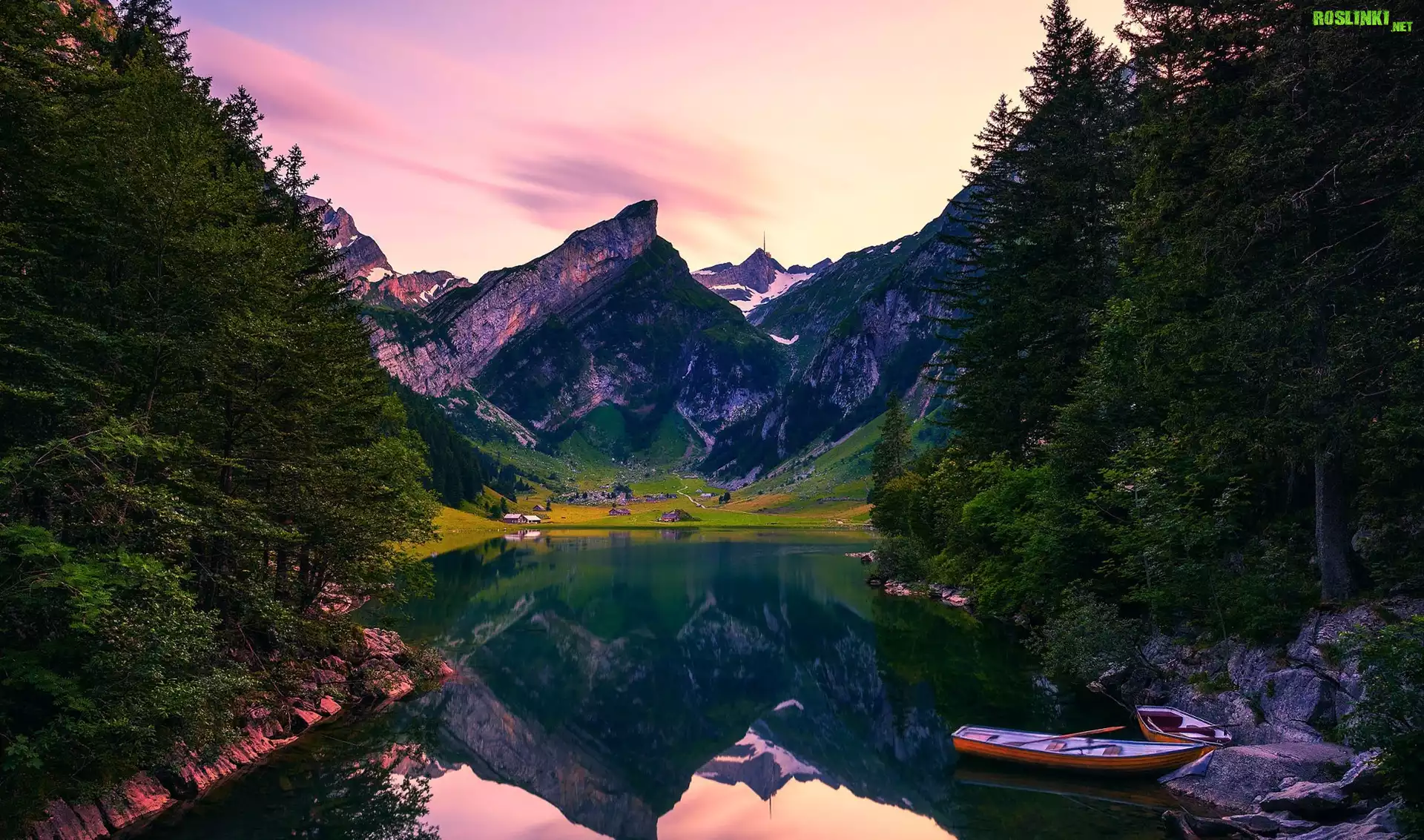 Rośliny: Szwajcaria, Góry, Alpy, Jezioro Seealpsee, Kamienie, Drzewa, Łódki, Domy