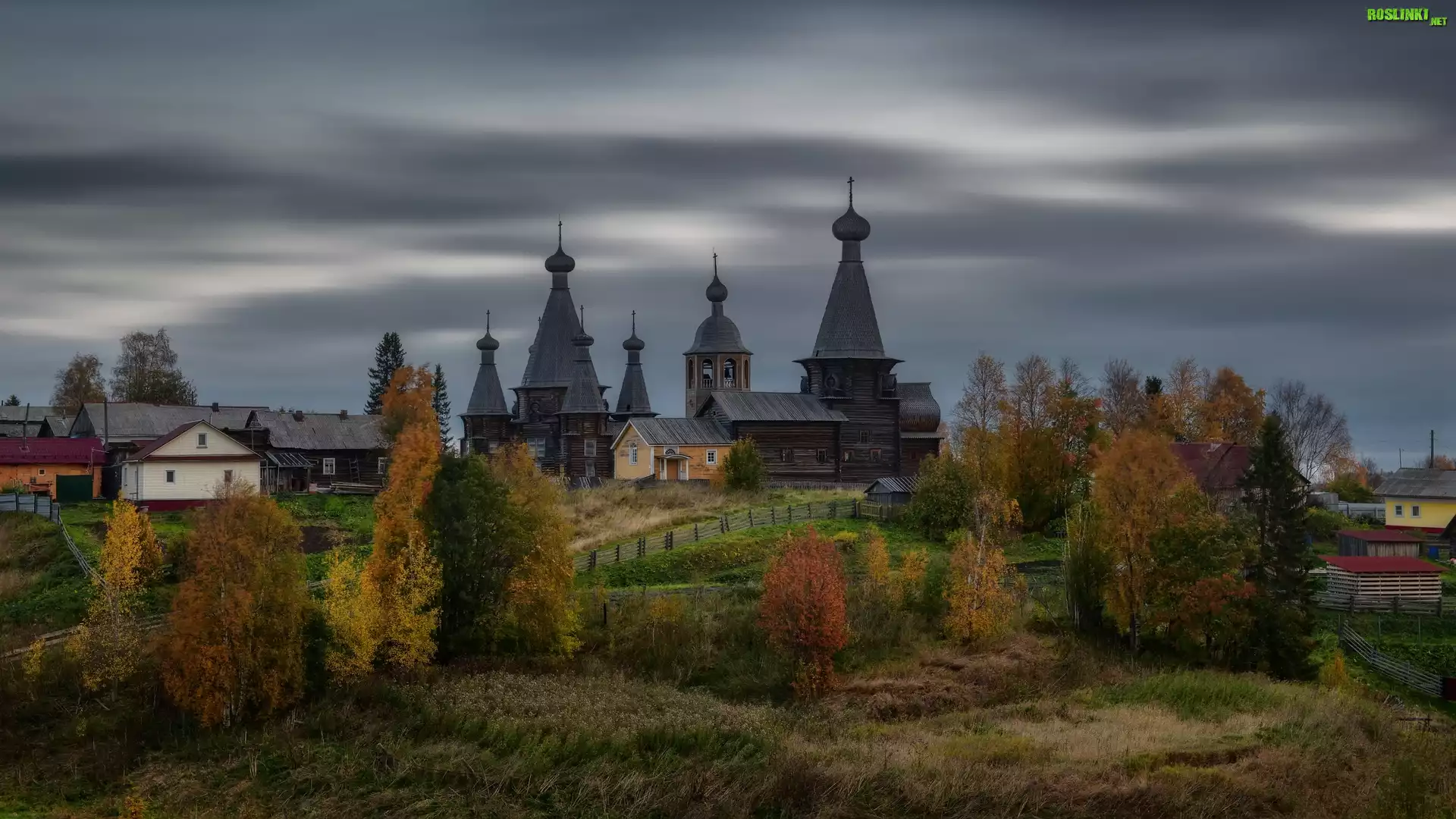 Rośliny: Wioska, Domy, Cerkiew, Drzewa, Chmury