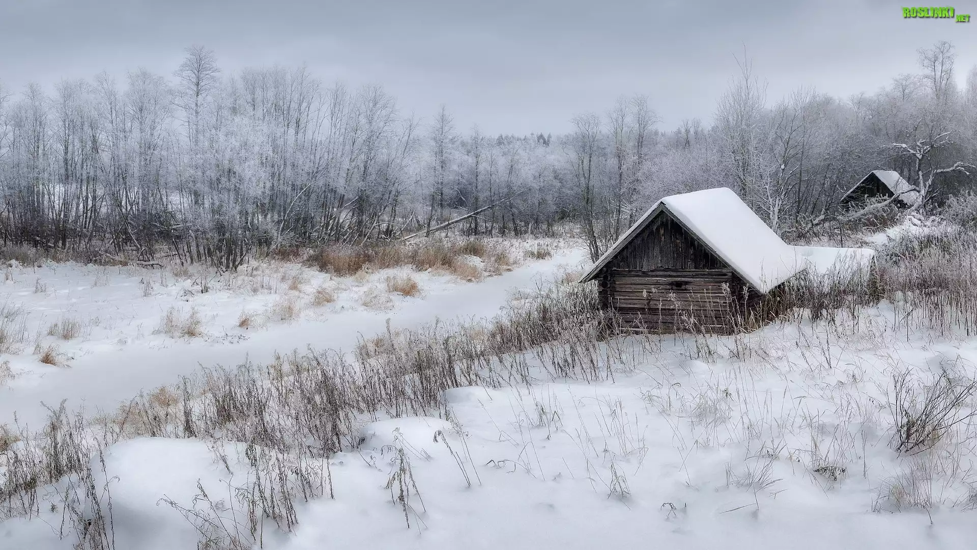 Rośliny: Drewniane, Domy, Droga, Drzewa, Zima