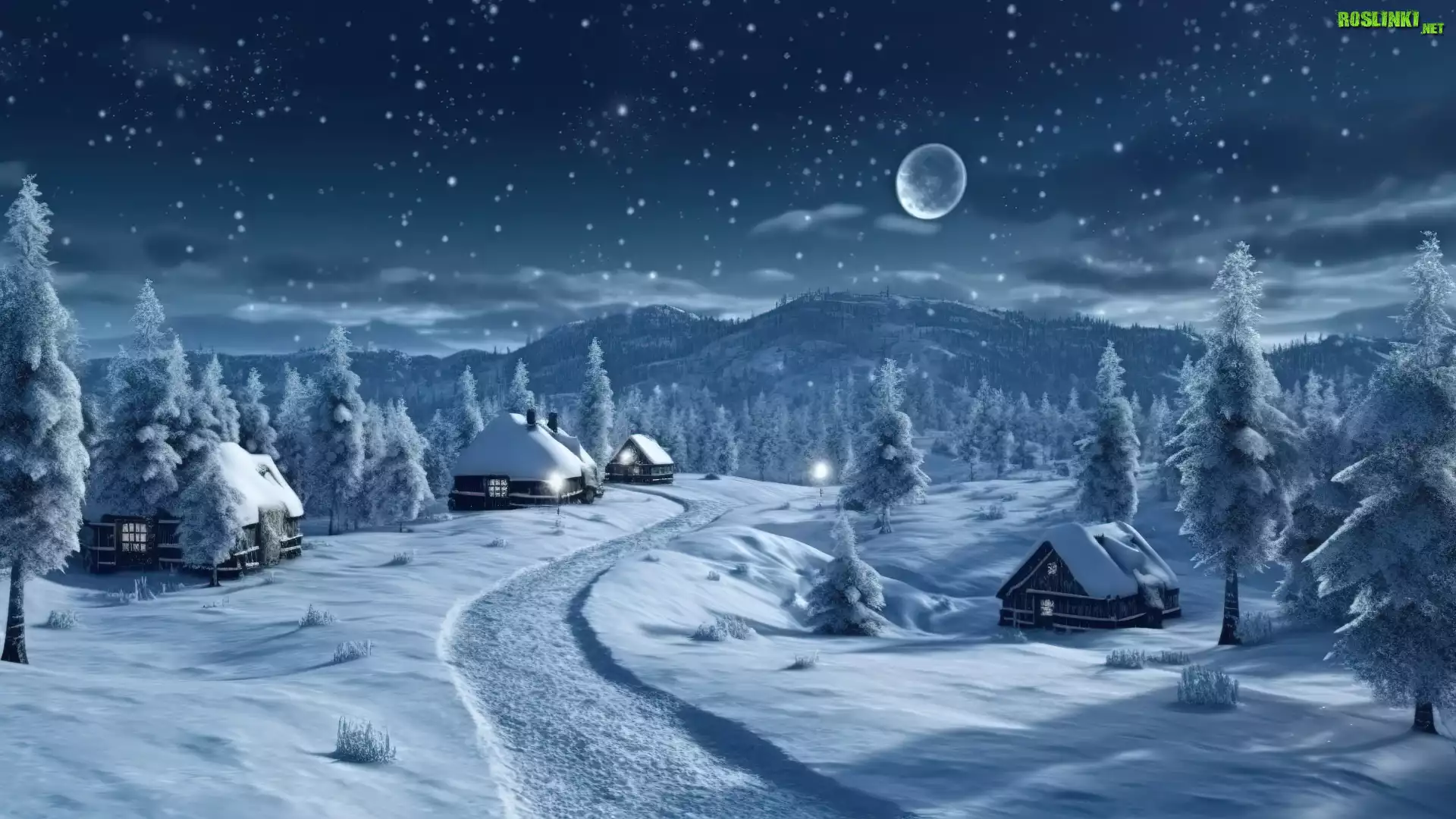 Rośliny: Zima, Droga, Drzewa, Domy, Księżyc, Noc, 2D