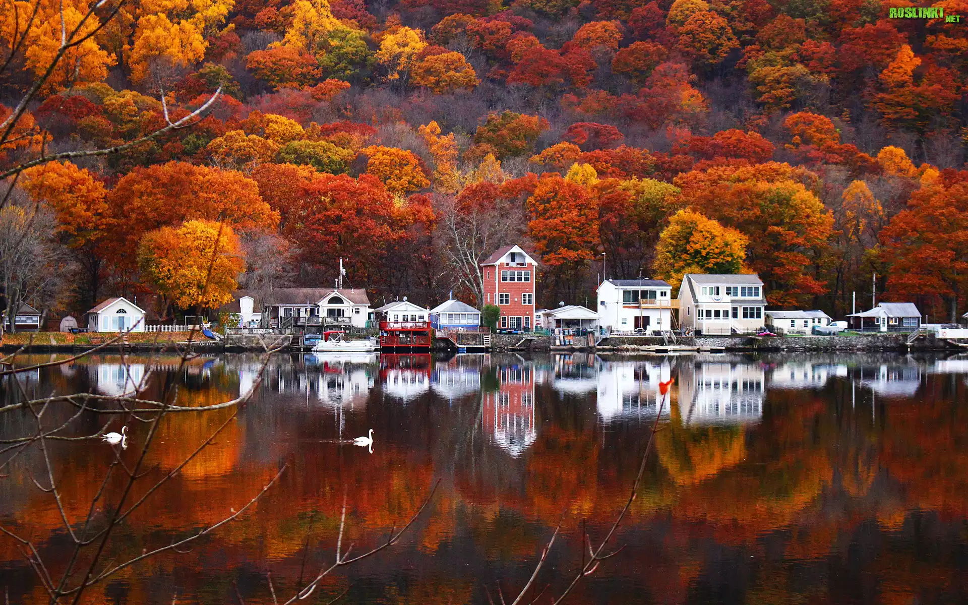 Rośliny: Jesień, Wzgórze, Drzewo, Domy, Jezioro, Łabędzie, Odbicie