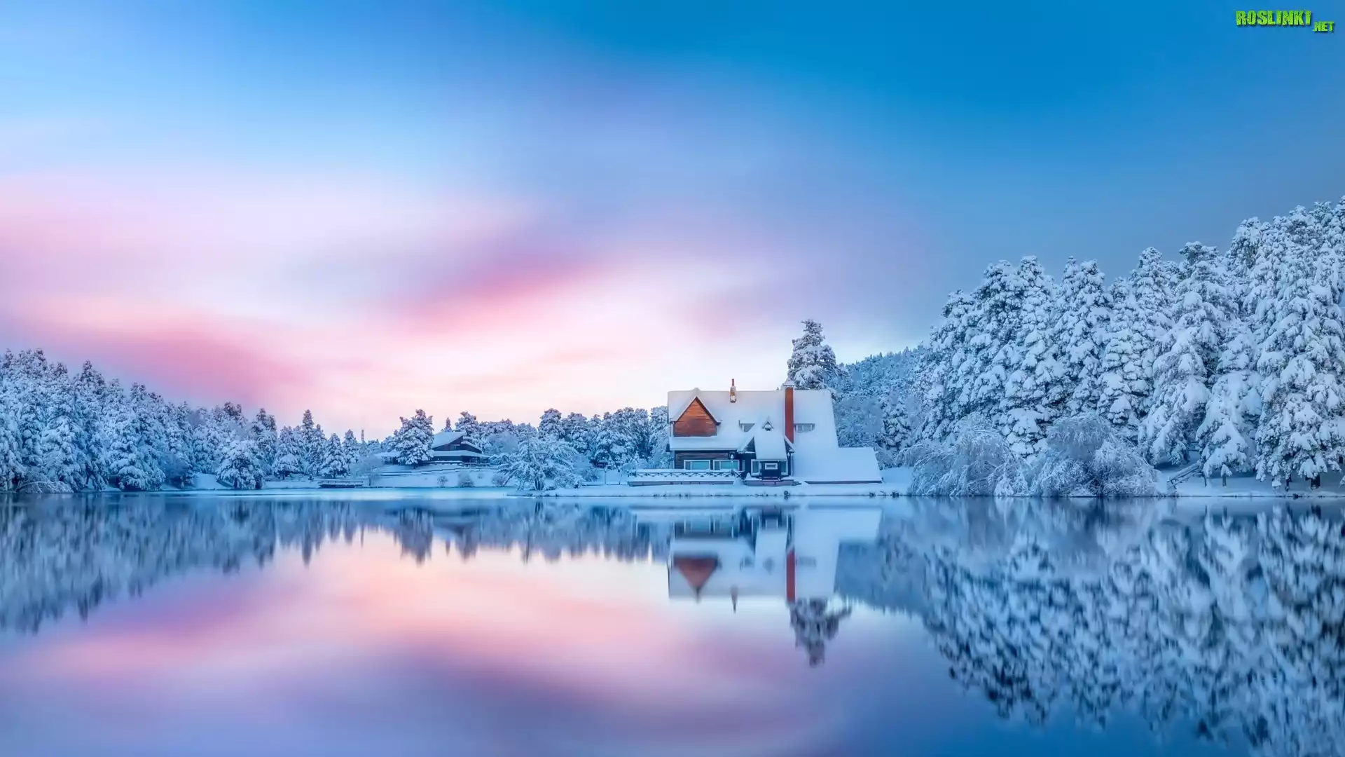 Rośliny: Jezioro, Domy, Lasy, Drzewa, Wschód słońca, Zima