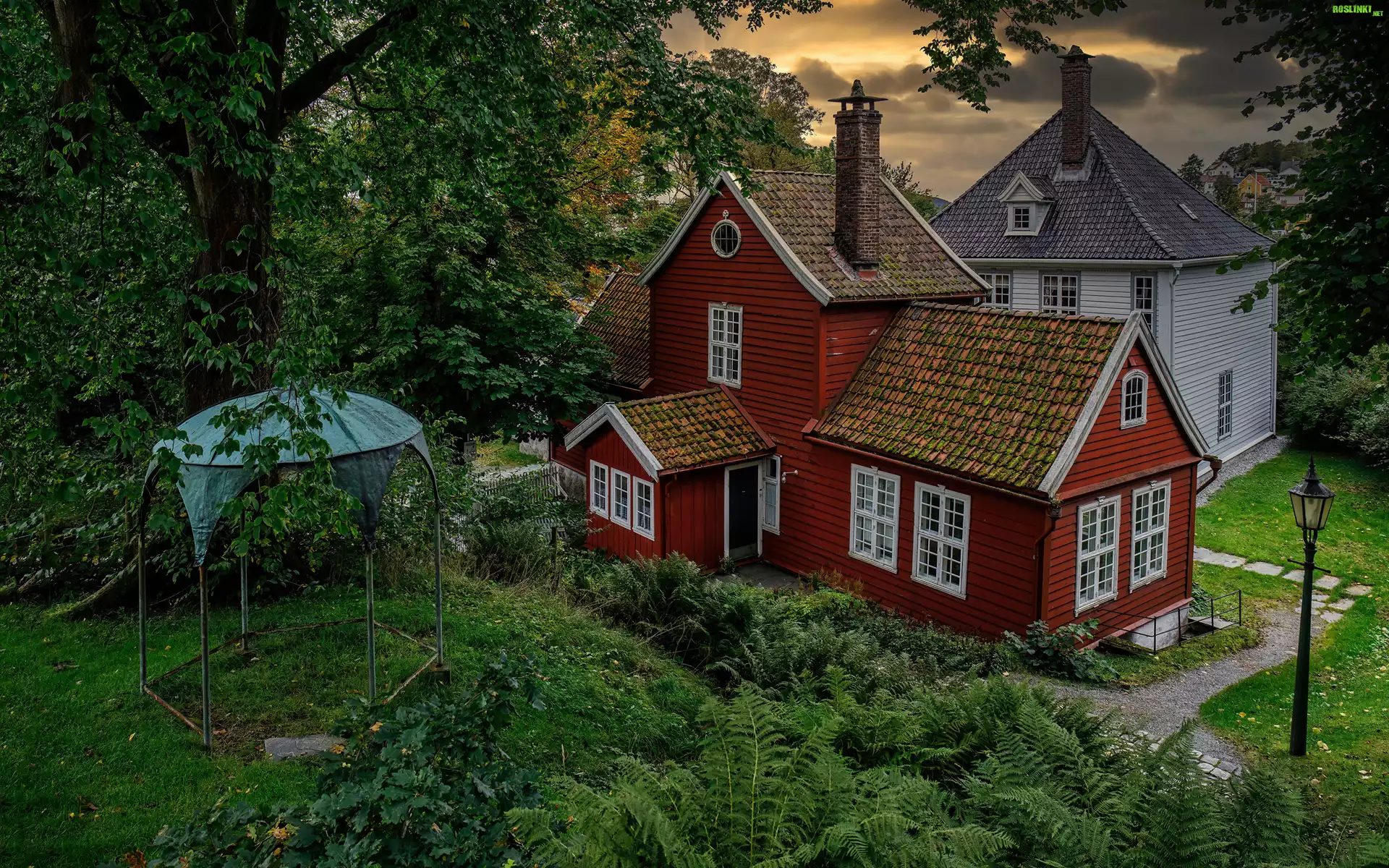 Drewniane, Domy, Latarnia, Drzewa, Krzewy