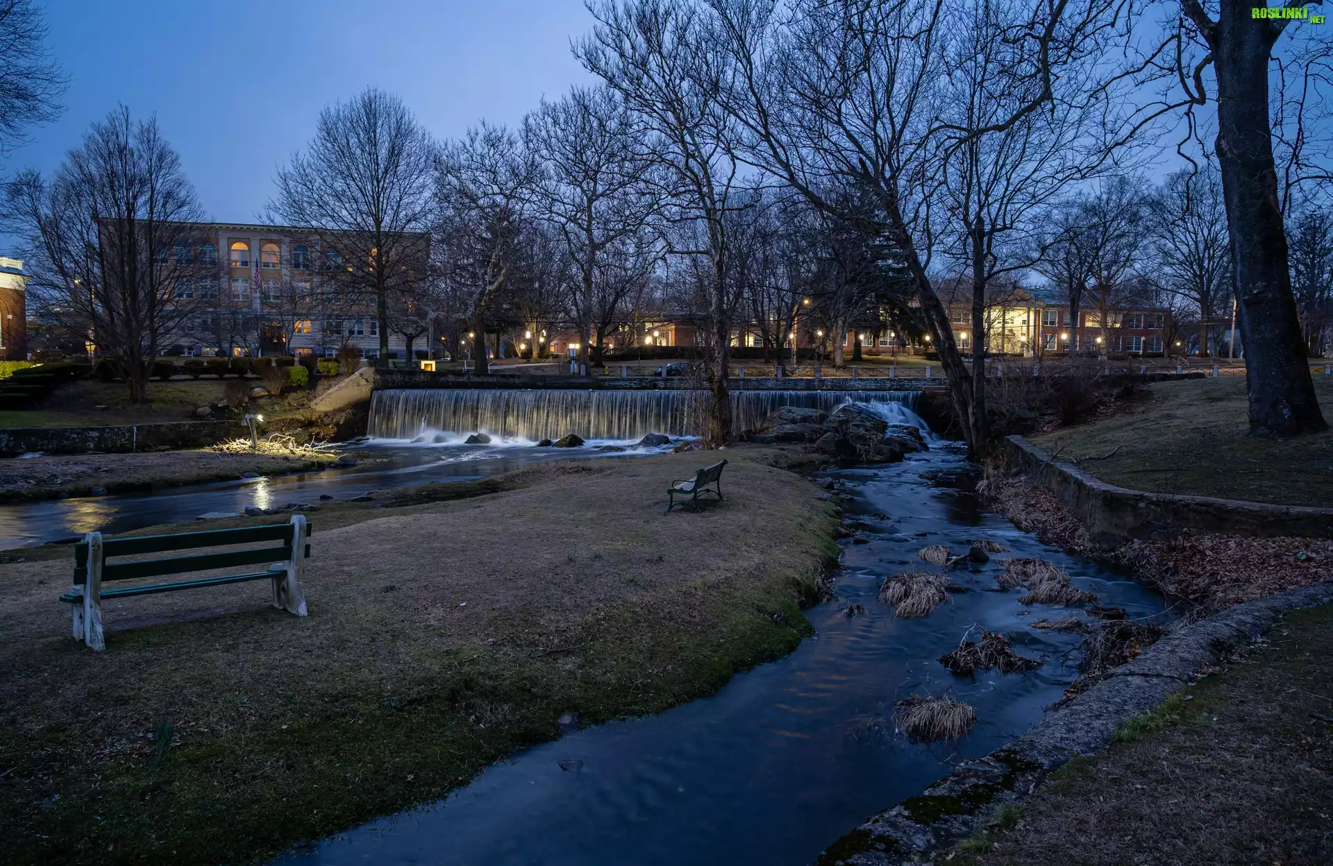 Domy, Ławki, Rzeka, Drzewa