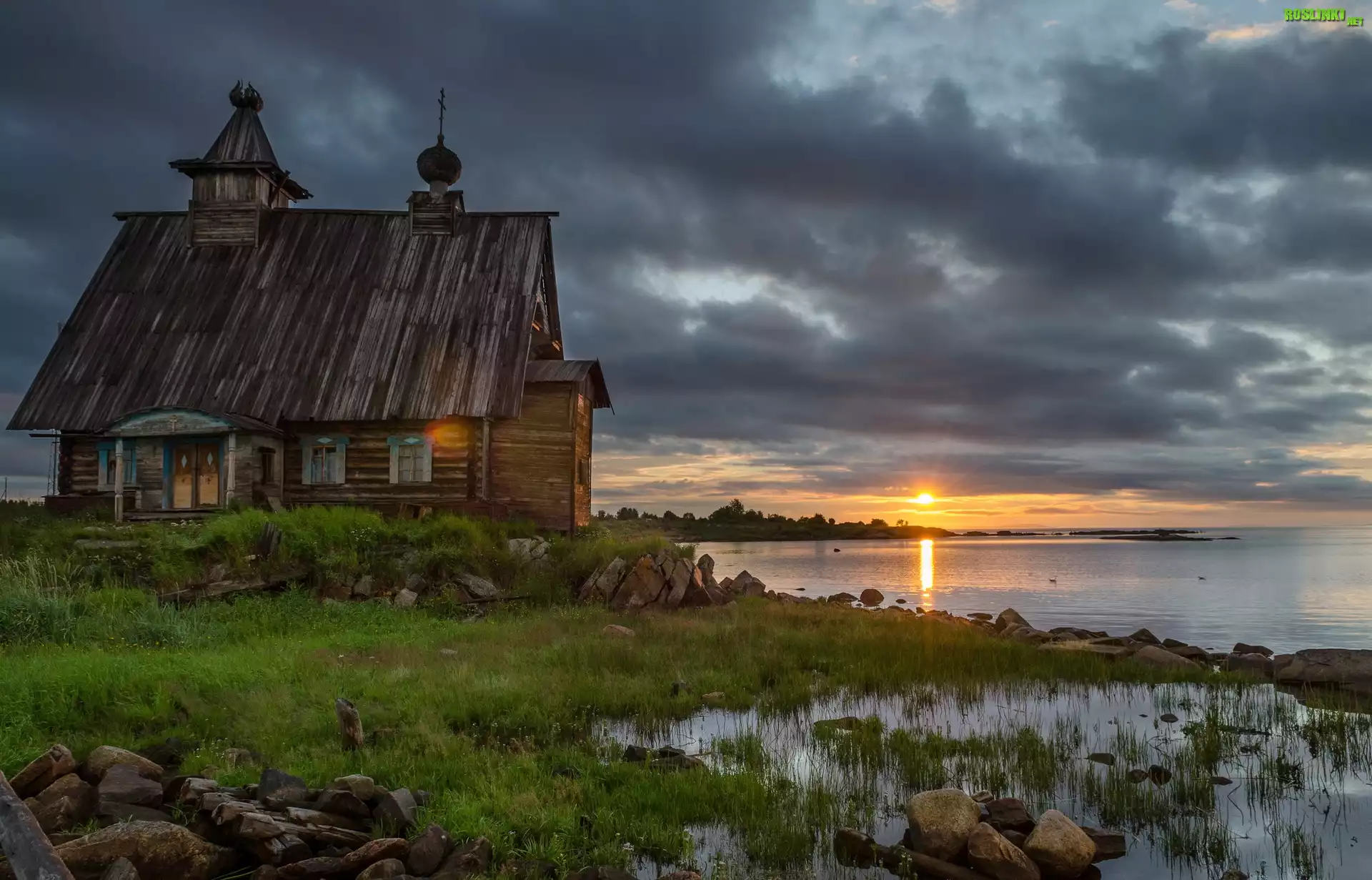 Rośliny: Ukraina, Drewniany, Kościół, Jezioro, Trawa, Zachód, Słońca
