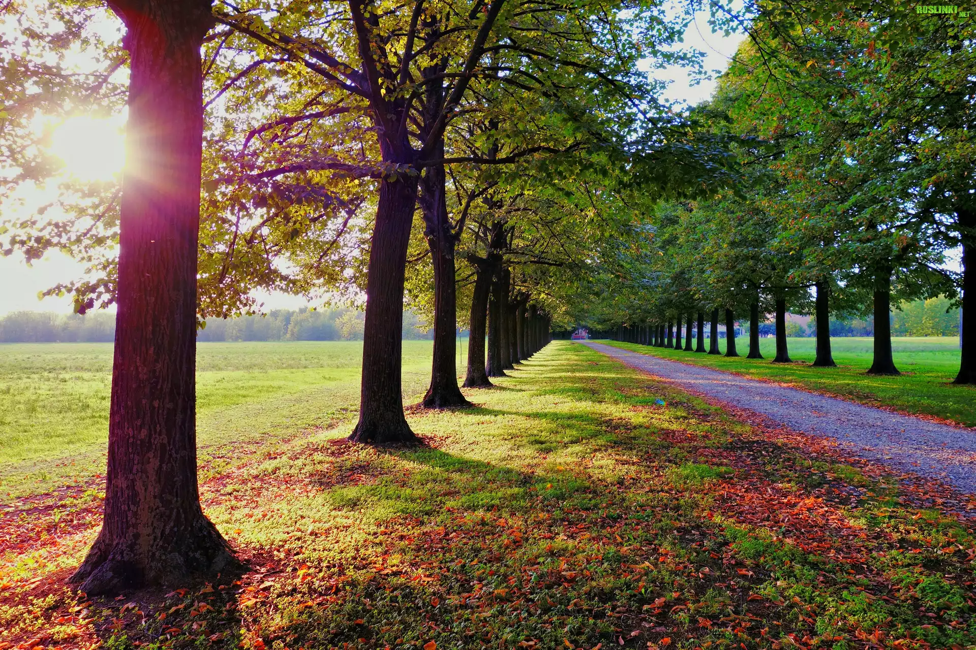 Rośliny: Aleja, Droga, Szpalery, Drzewa, Łąka, Promienie słońca