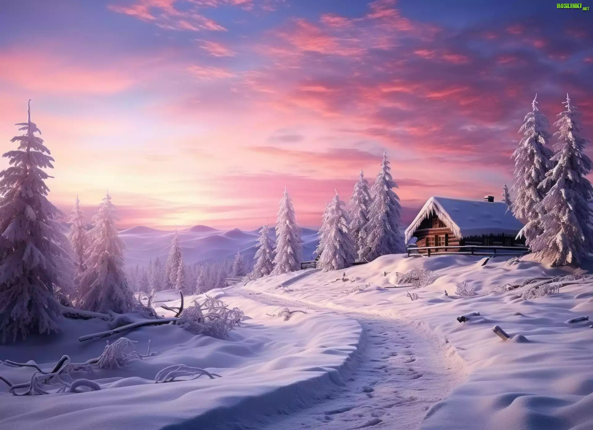 Rośliny: Zima, Dom, Drzewa, Droga, Zachód słońca, 2D