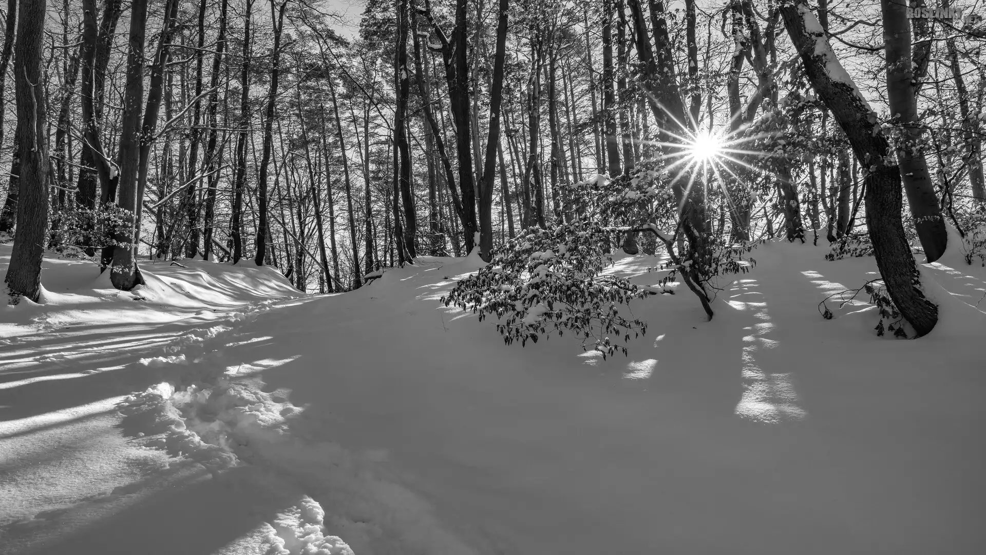 Rośliny: Zima, Las, Drzewa, Śnieg, Promienie słońca, Zaśnieżona, Droga