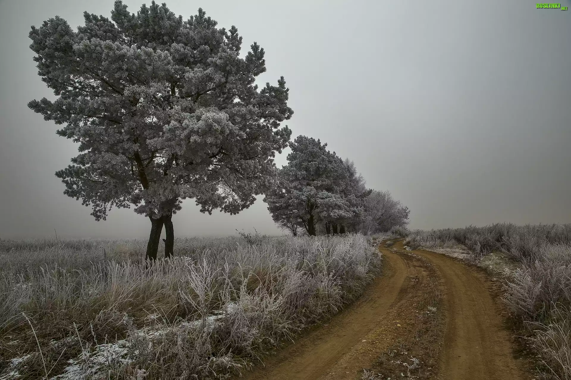 Rośliny: Droga, Oszronione, Drzewa, Mgła