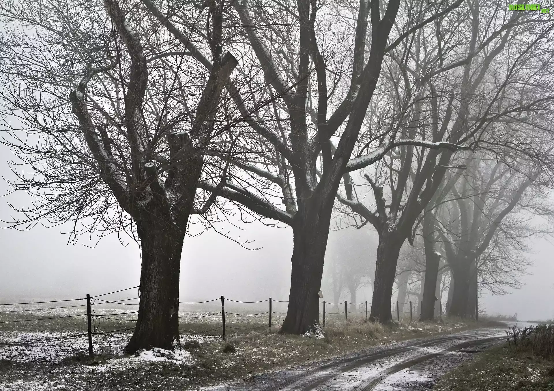Rośliny: Zima, Droga, Drzewa, Mgła, Pole