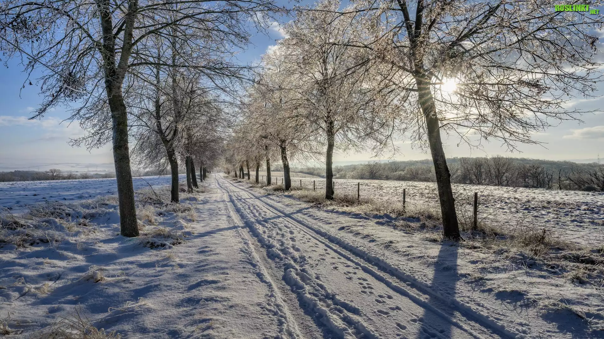 Rośliny: Zima, Droga, Drzewa, Pole, Słońce