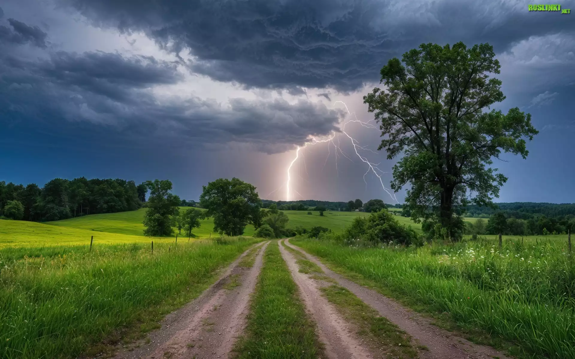 Rośliny: Droga, Burza, Błyskawice, Pola, Łąki, Trawa, Drzewa, Grafika AI