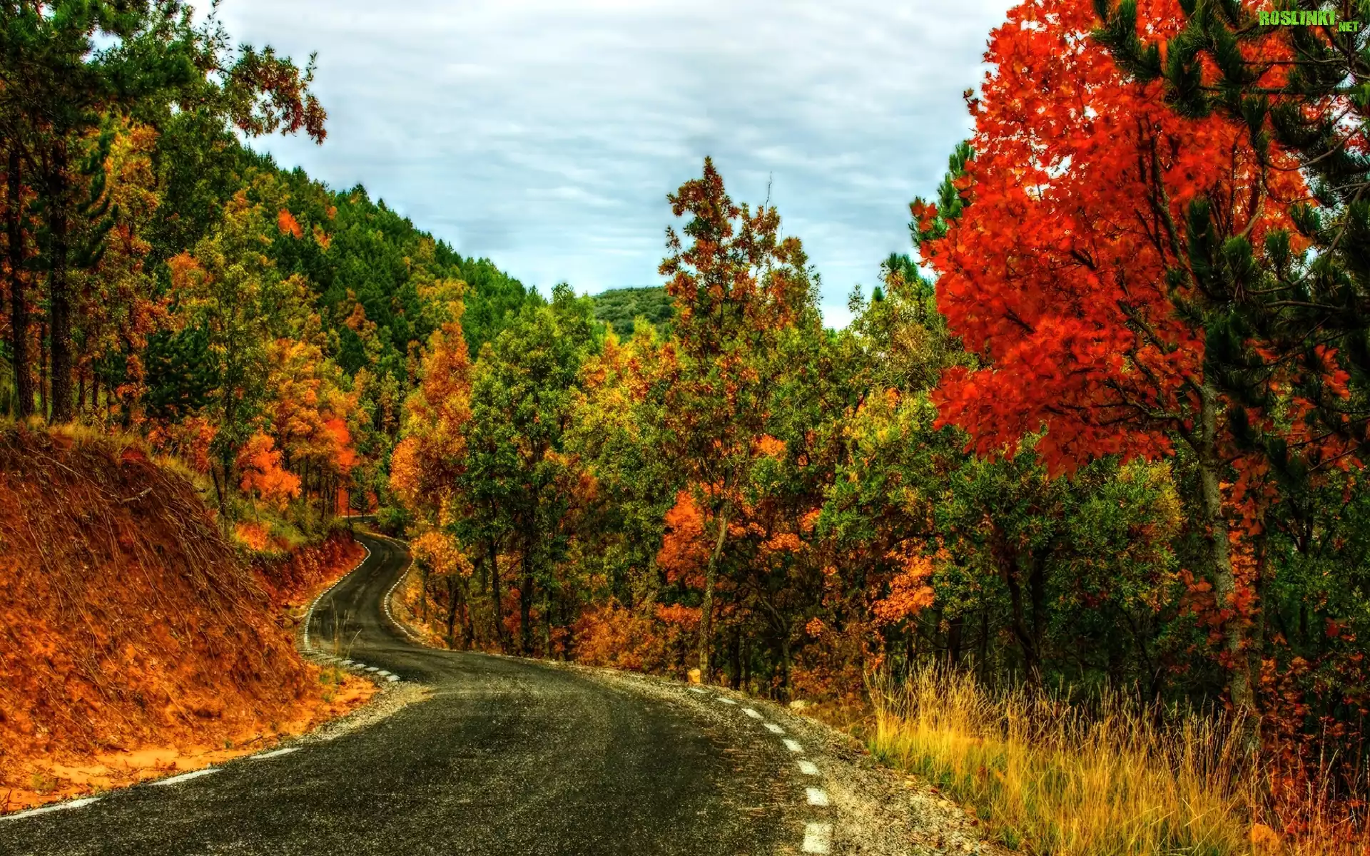 Rośliny: Droga, Zakręt, Drzewa, Jesień