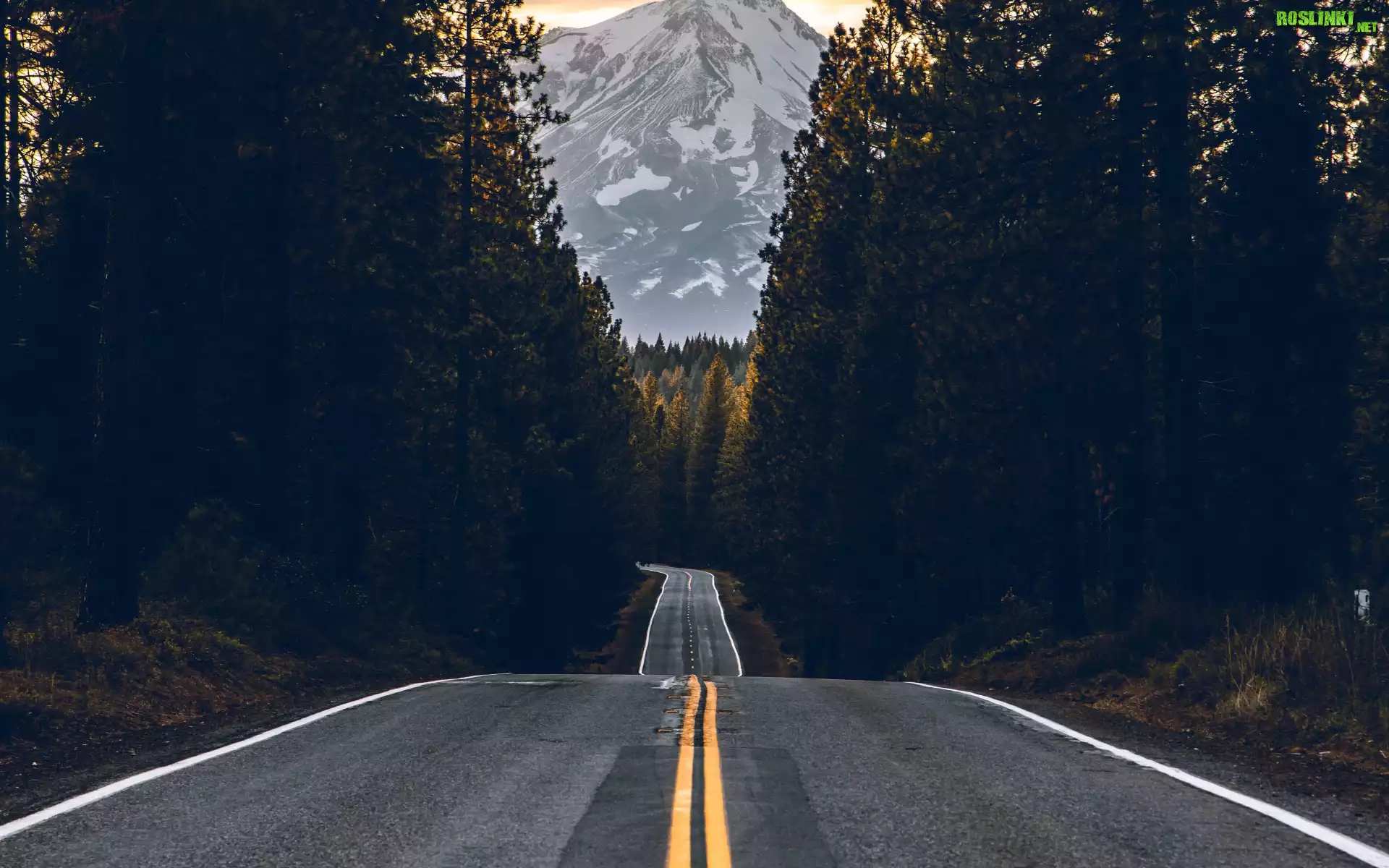 Rośliny: Las, Droga, Niebo, Drzewa, Zachód słońca, Góra