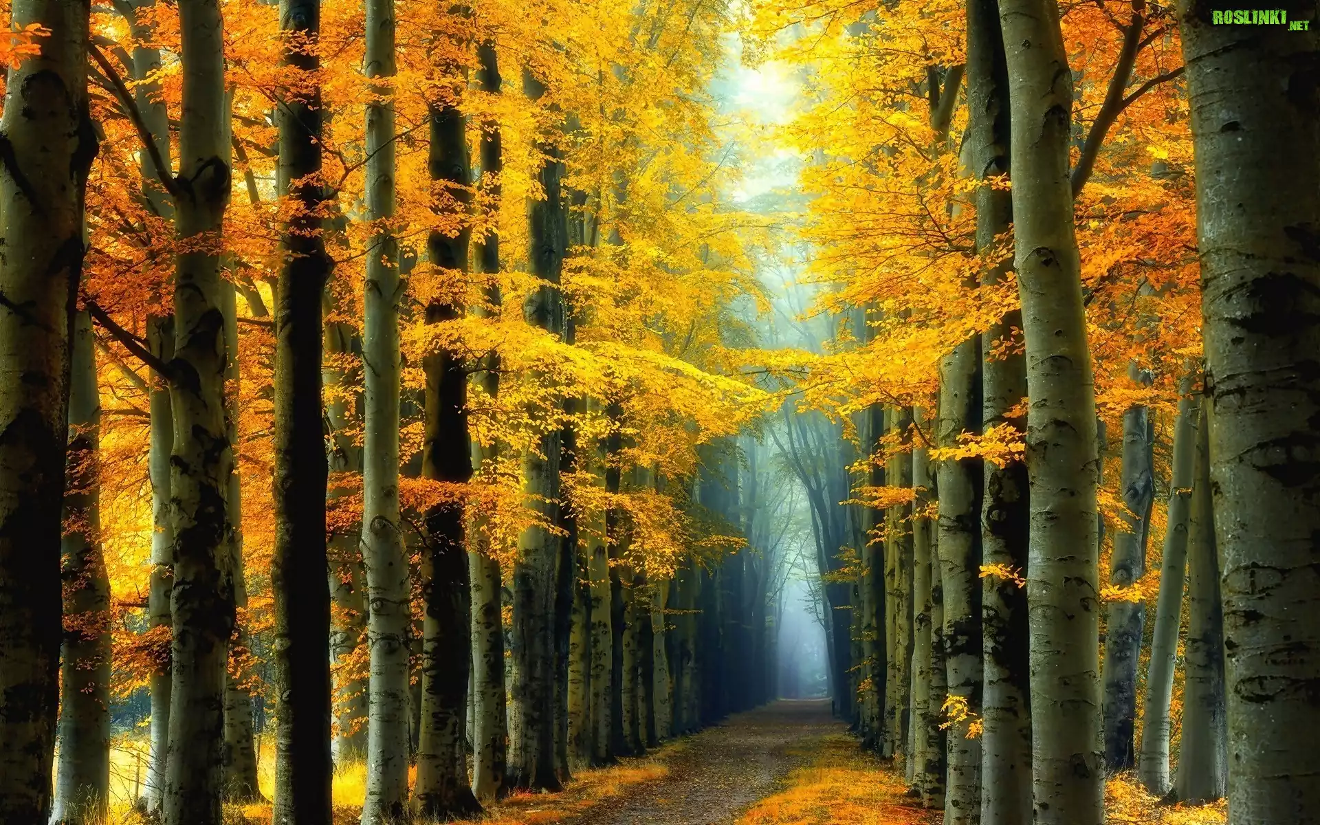 Rośliny: Las, Droga, Drzewa, Topole osikowe, Mgła, Jesień