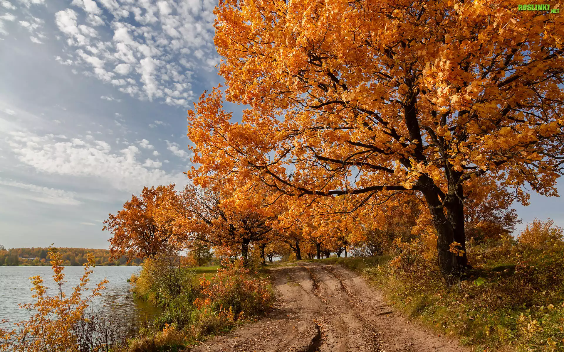 Droga, Drzewa, Jezioro, Trawa, Lasy, Jesień