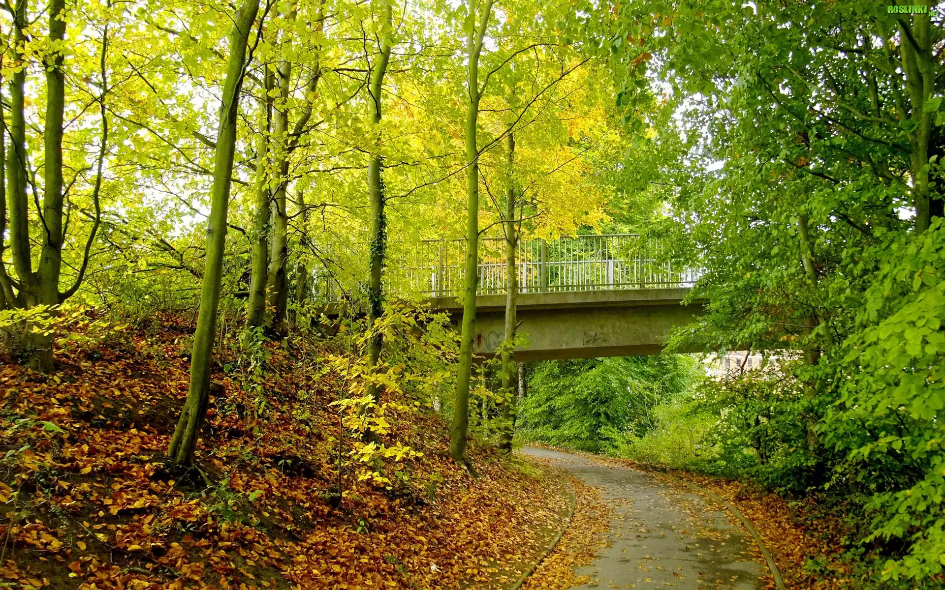 Rośliny: Droga, Most, Drzewa, Liście, Jesień