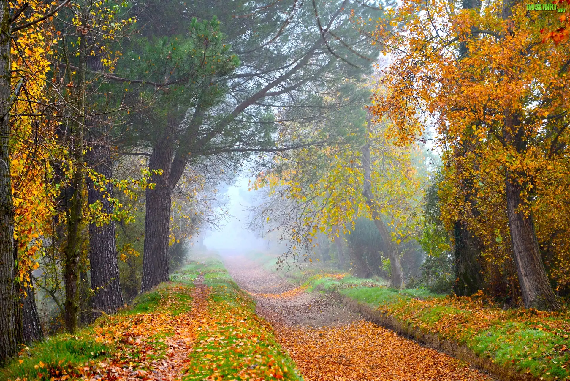 Rośliny: Droga, Drzewa, Poranek, Mgła, Jesień