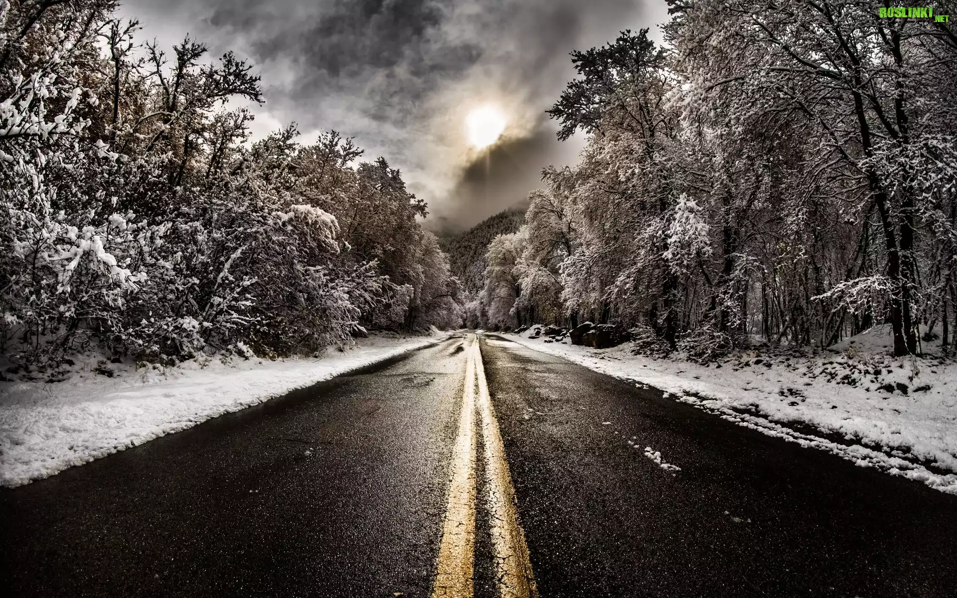 Rośliny: Droga, Drzewa, Śnieg, Słońce