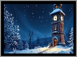 Rośliny: Zima, Drzewa, Wieża, Droga, Zegar, Noc