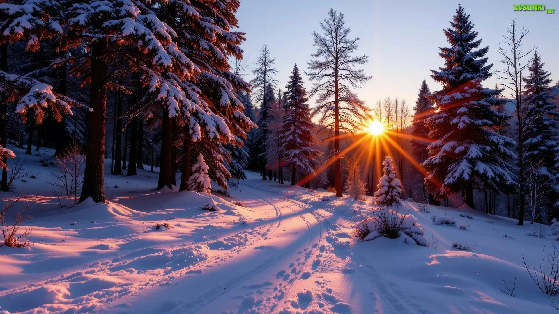Rośliny: Zima, Las, Ośnieżone, Drzewa, Promienie słońca, Zaśnieżona, Droga