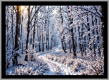 Zima, Las, Ośnieżone, Drzewa, Rośliny, Promienie słońca, Droga