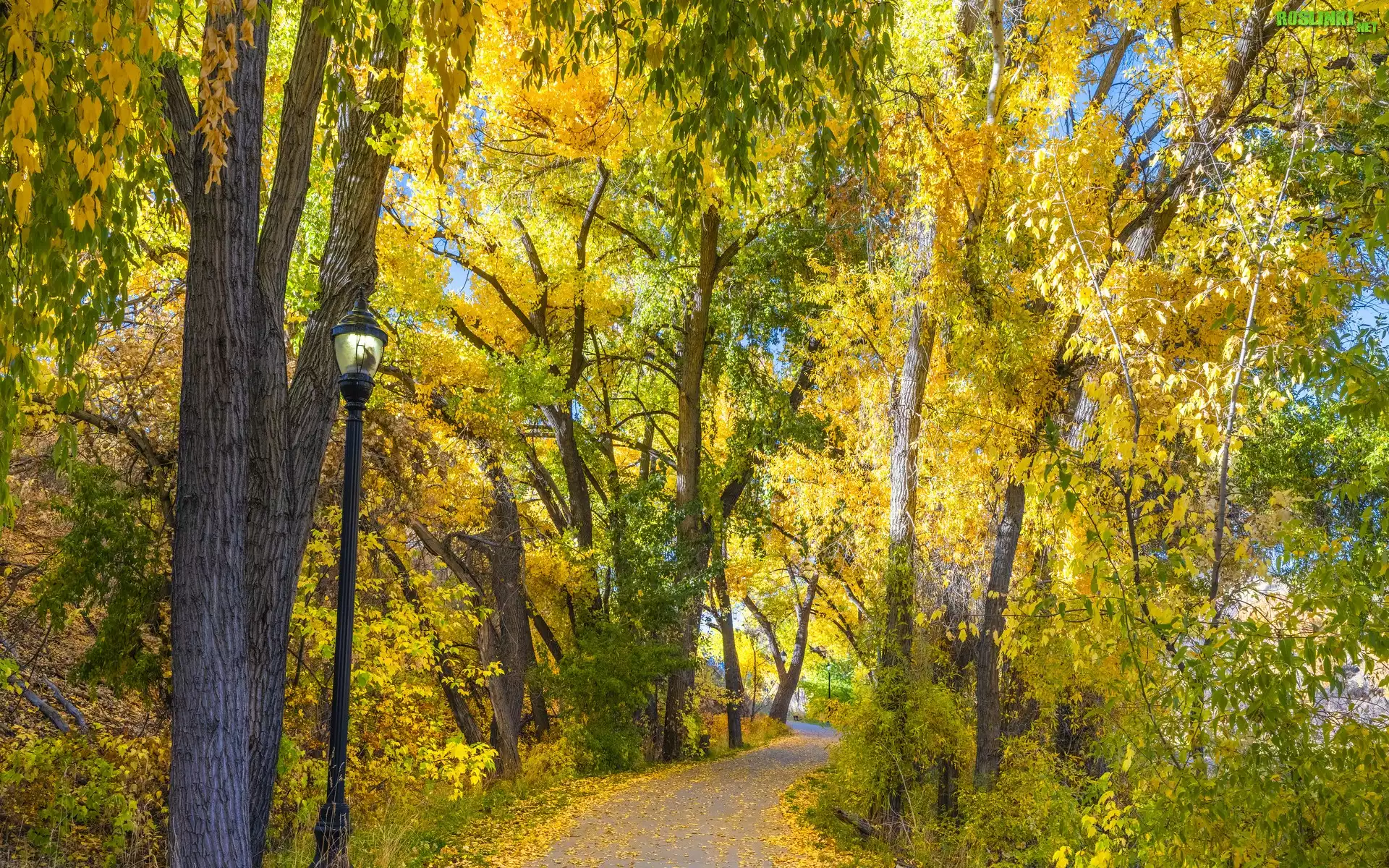 Jesień, Drzewa, Liście, Droga, Latarnia, Park