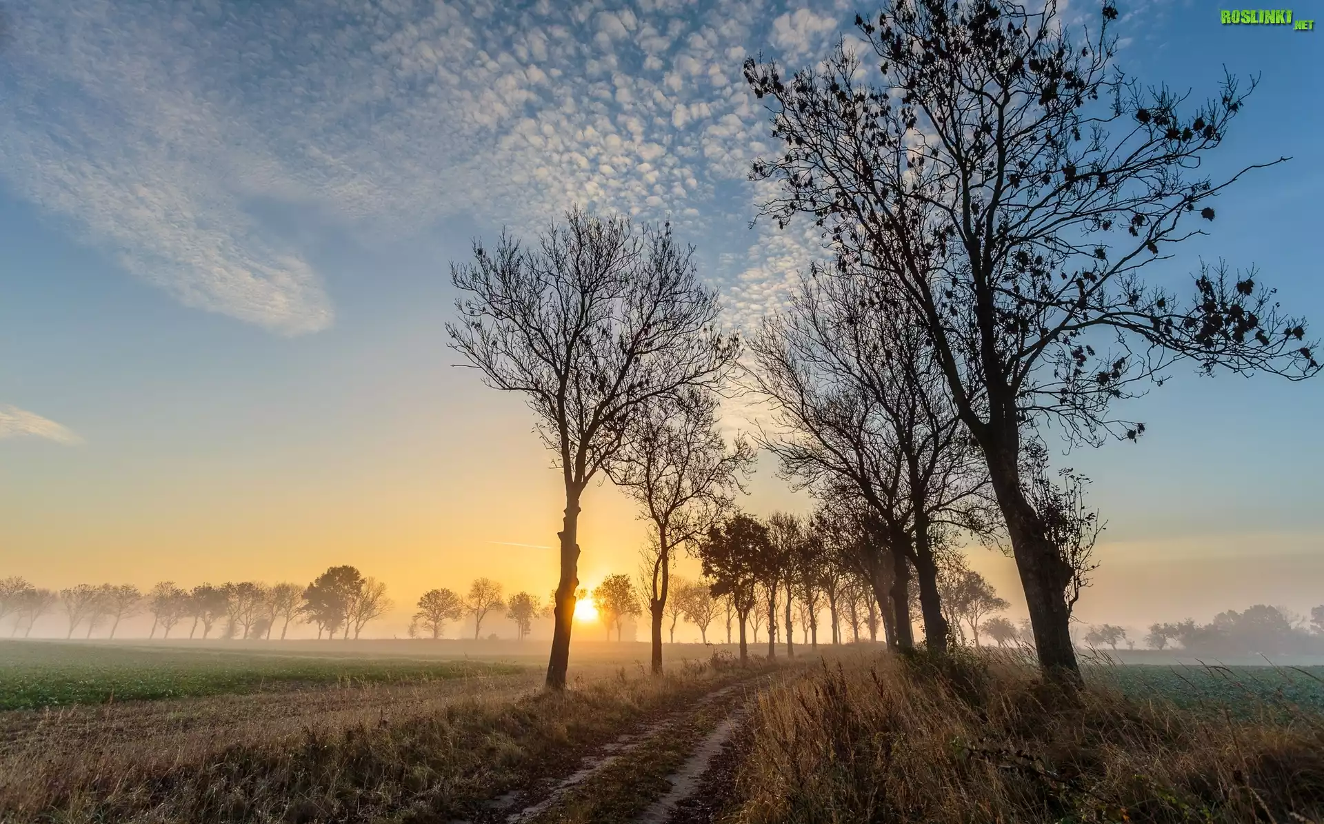 Rośliny: Pola, Droga, Drzewa, Wschód słońca, Mgła, Chmury