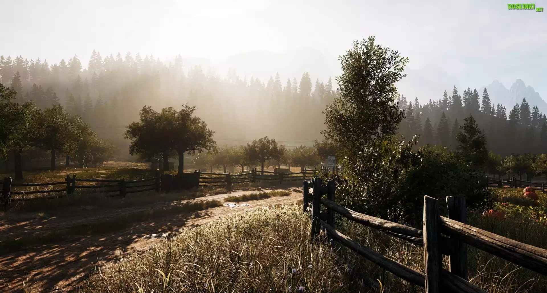 Rośliny: Droga, Ogrodzenie, Drzewa, Pole, Mgła