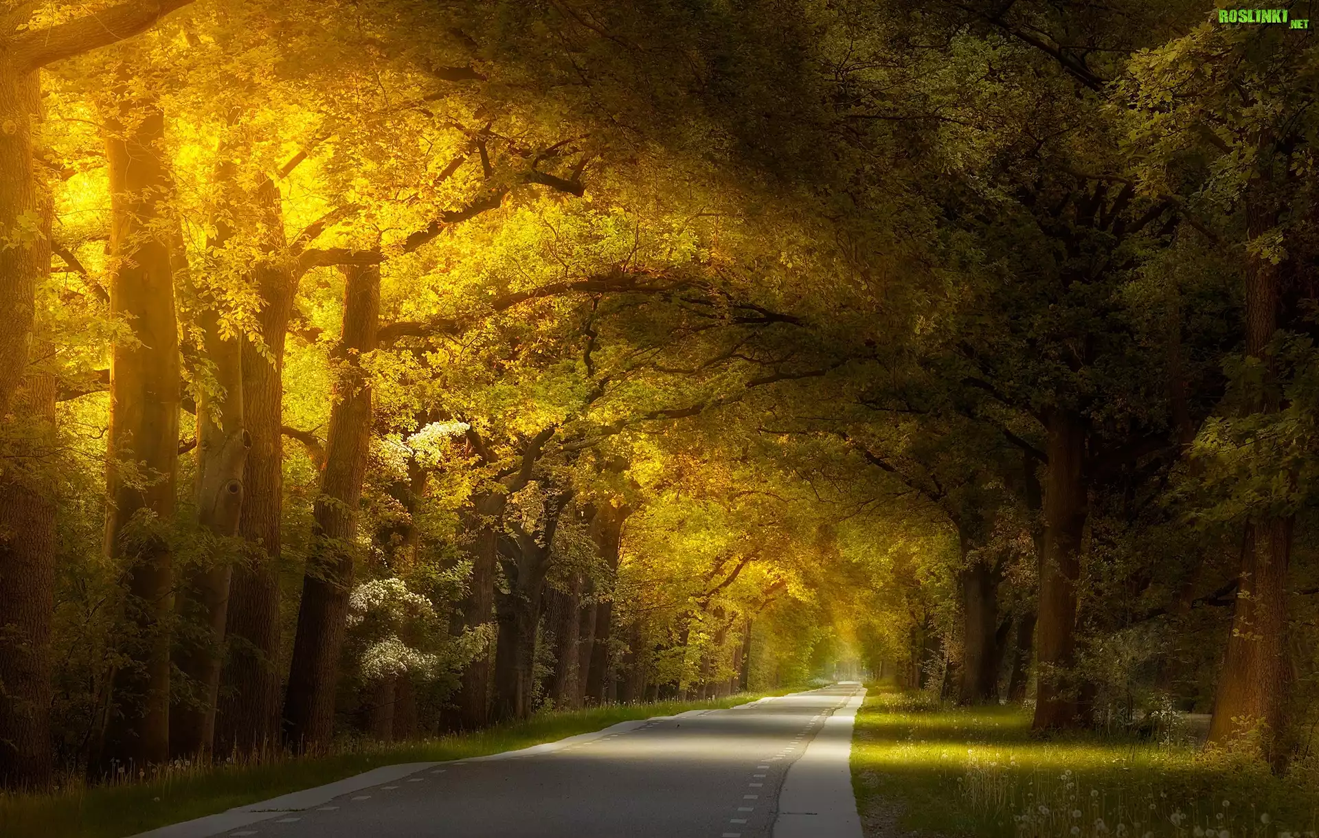 Rośliny: Droga, Las, Drzewa, Poranek, Jesień