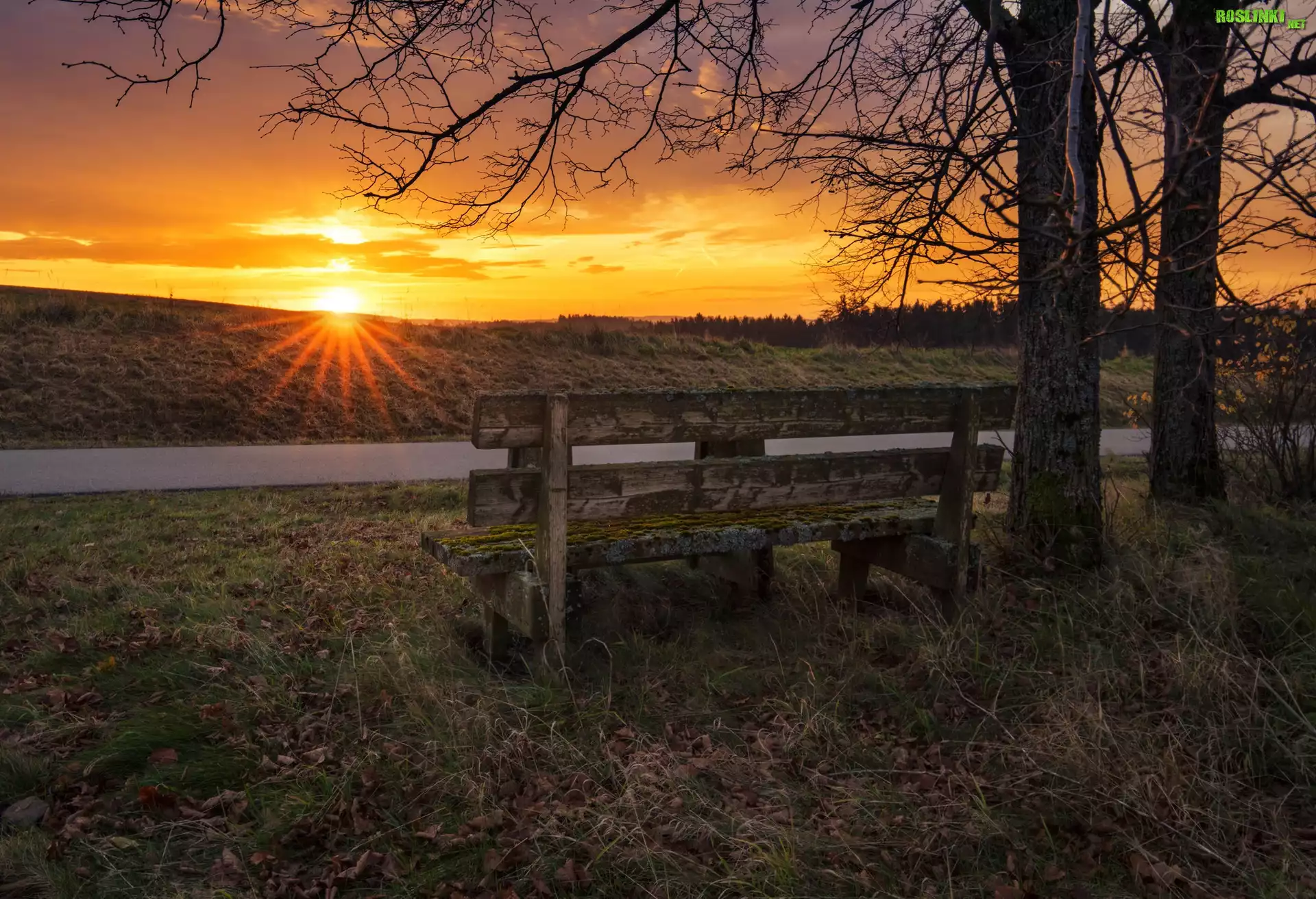 Rośliny: Droga, Drzewa, Ławka, Promienie słońca