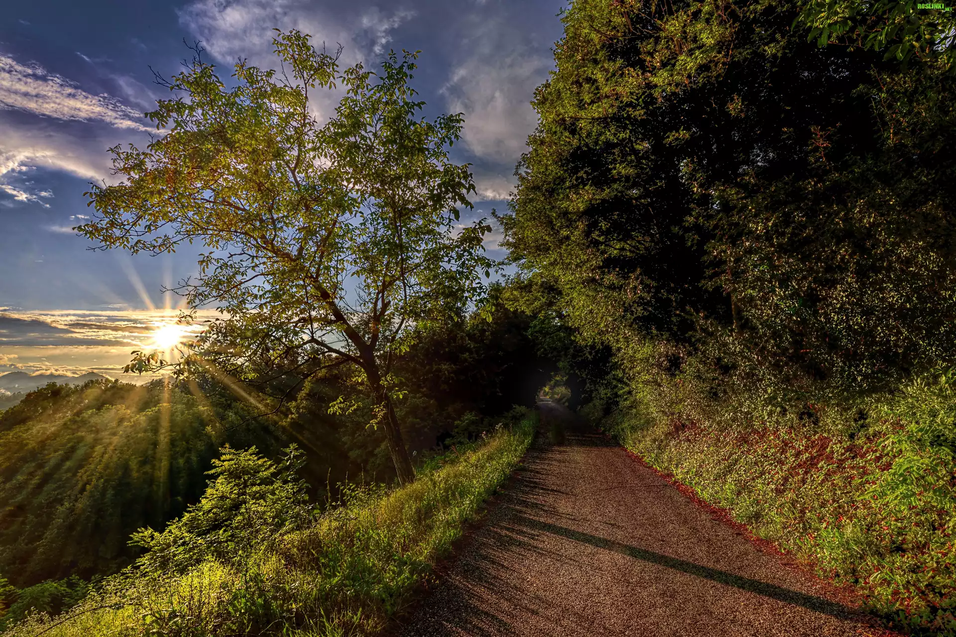 Rośliny: Droga, Drzewa, Chmury, Promienie, Słońca