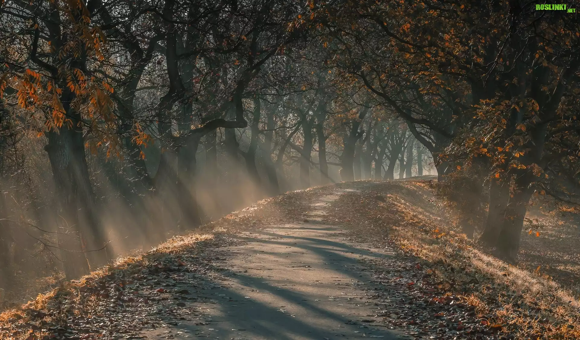 Rośliny: Droga, Drzewa, Mgła, Jesień, Przebijające Światło