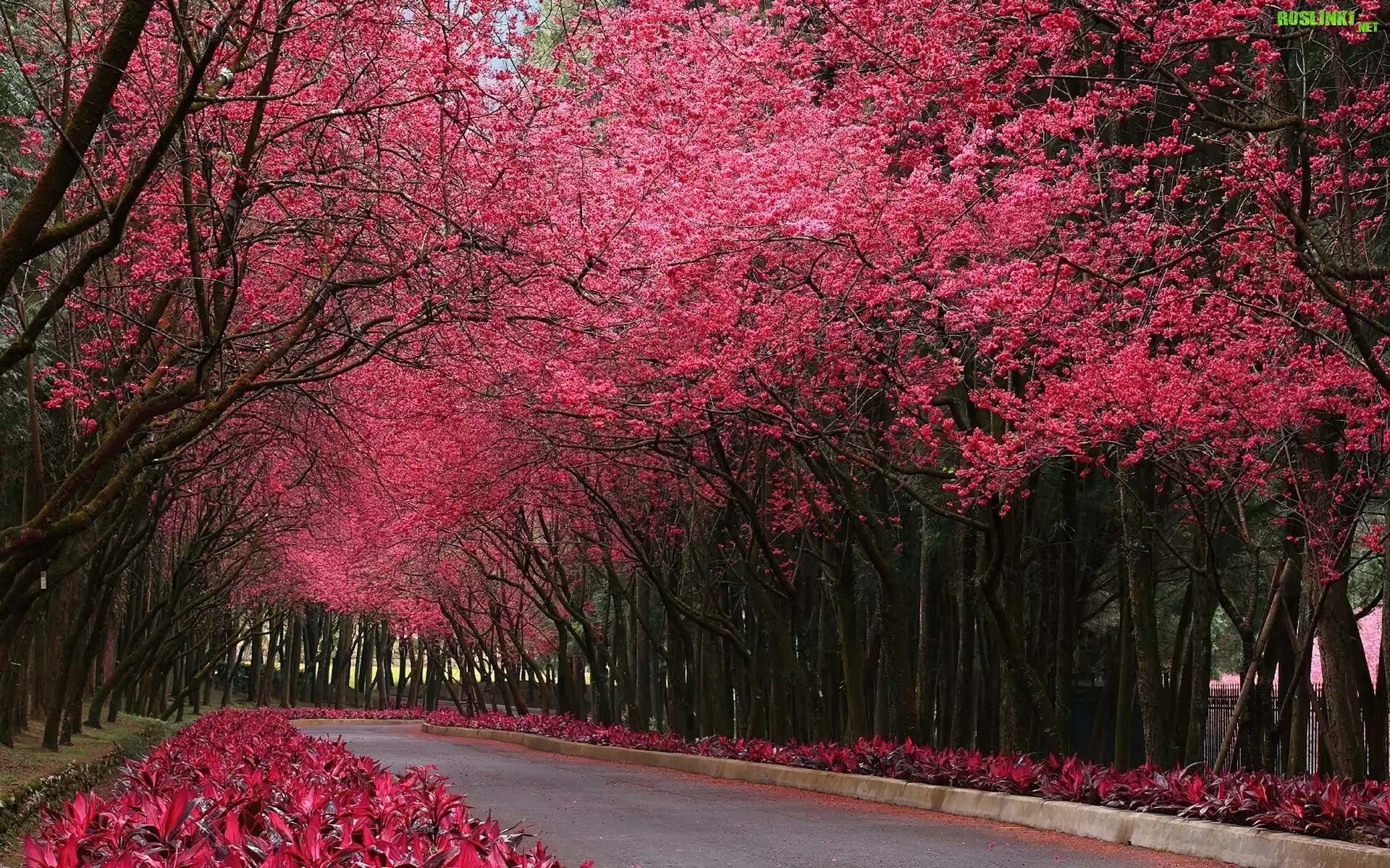 Rośliny: Droga, Kwitnące, Różowe, Drzewa