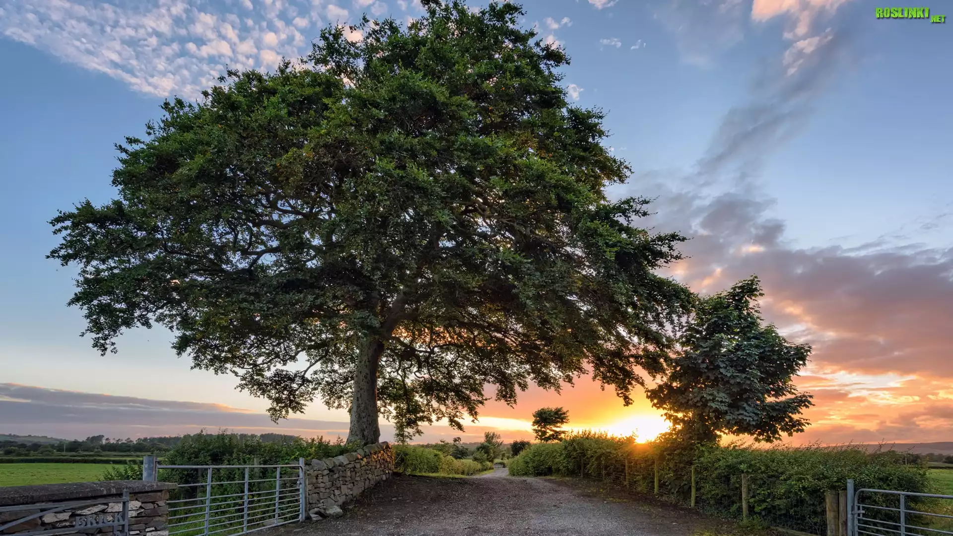 Rośliny: Droga, Ogrodzenie, Drzewa, Wschód słońca, Chmury