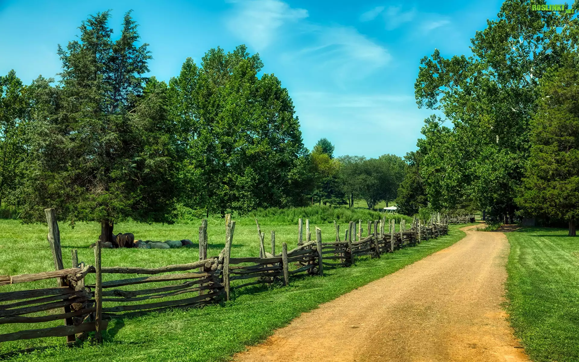 Rośliny: Droga, Drzewa, Trawa, Ogrodzenie
