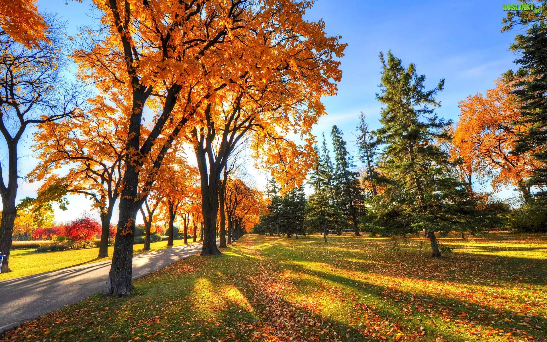 Rośliny: Droga, Drzewa, Liście, Przebijające, Światło, Jesień