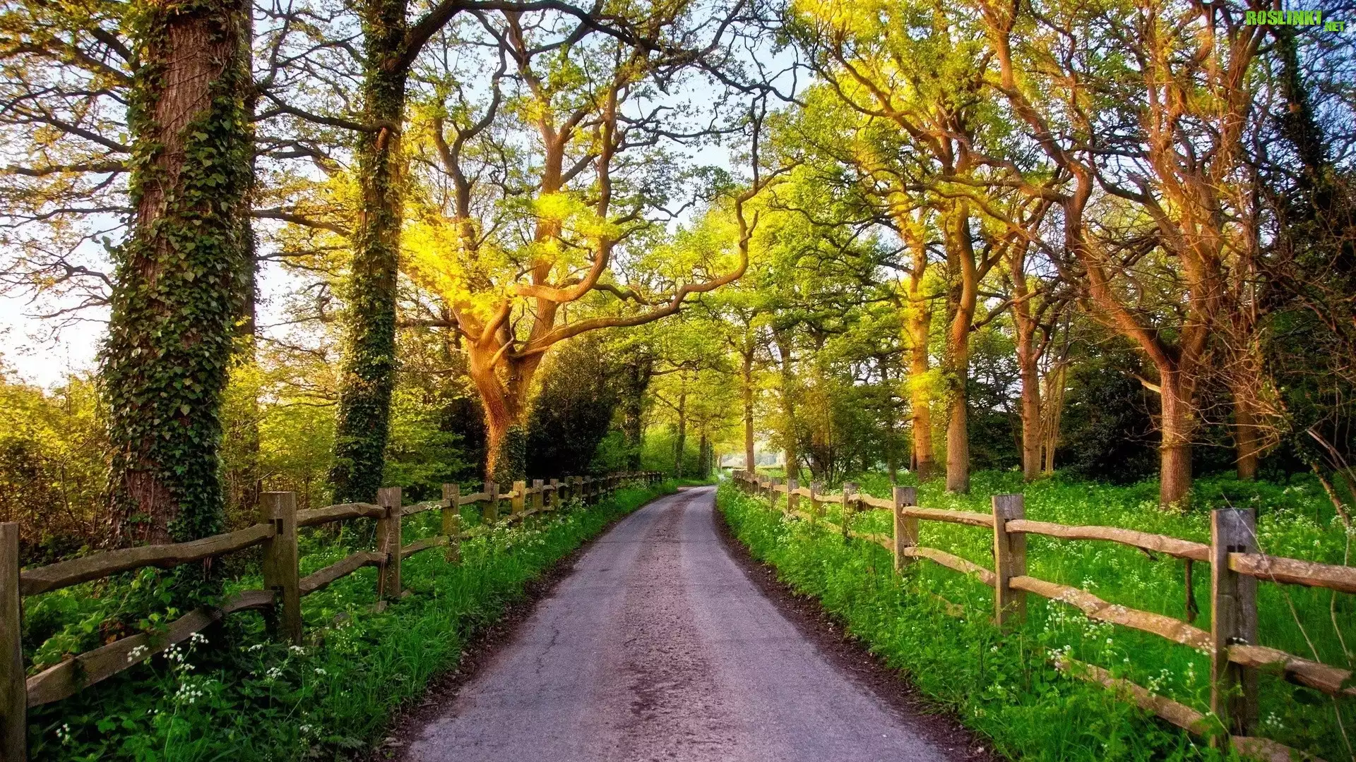 Rośliny: Droga, Drzewa, Płot, Przebijające, Światło, Wiosna