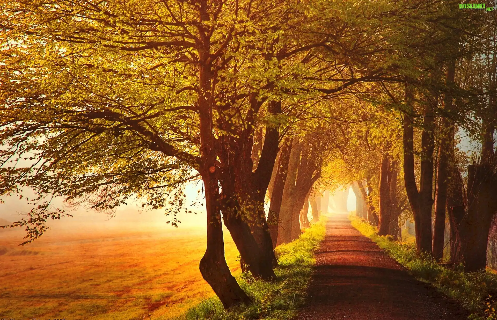 Rośliny: Droga, Drzewa, Pola, Przebijające, Światło, Jesień
