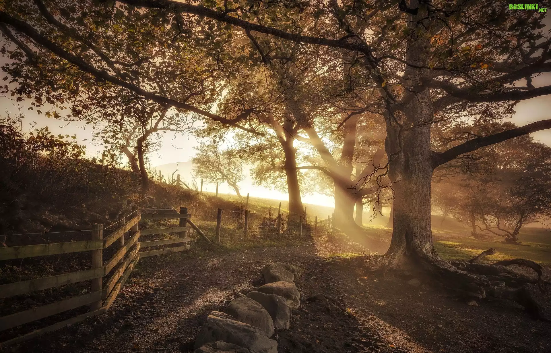 Rośliny: Wiejska, Droga, Ogrodzenie, Drzewa, Przebijające światło, Świt