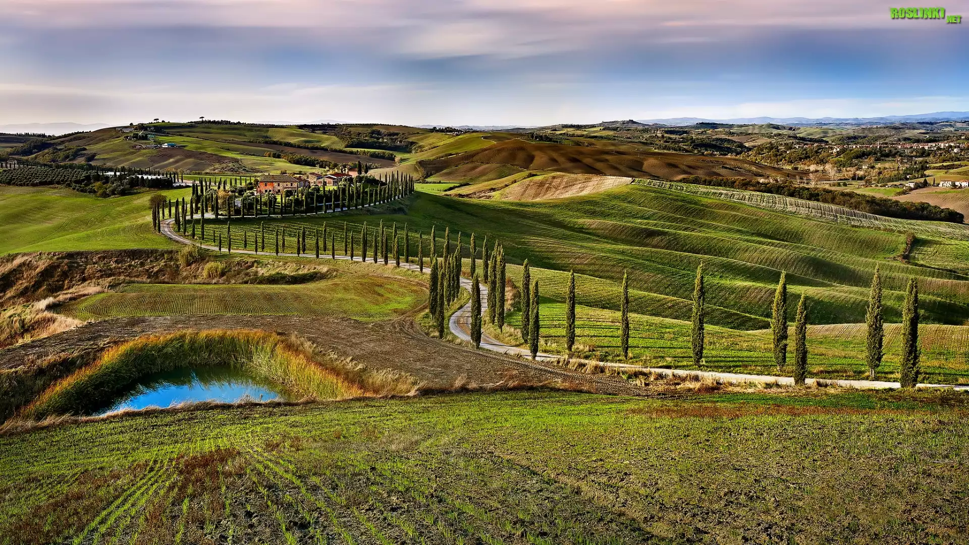 Rośliny: Domy, Droga, Drzewo, Las, Staw, Toskania, Włochy, Wzgórza