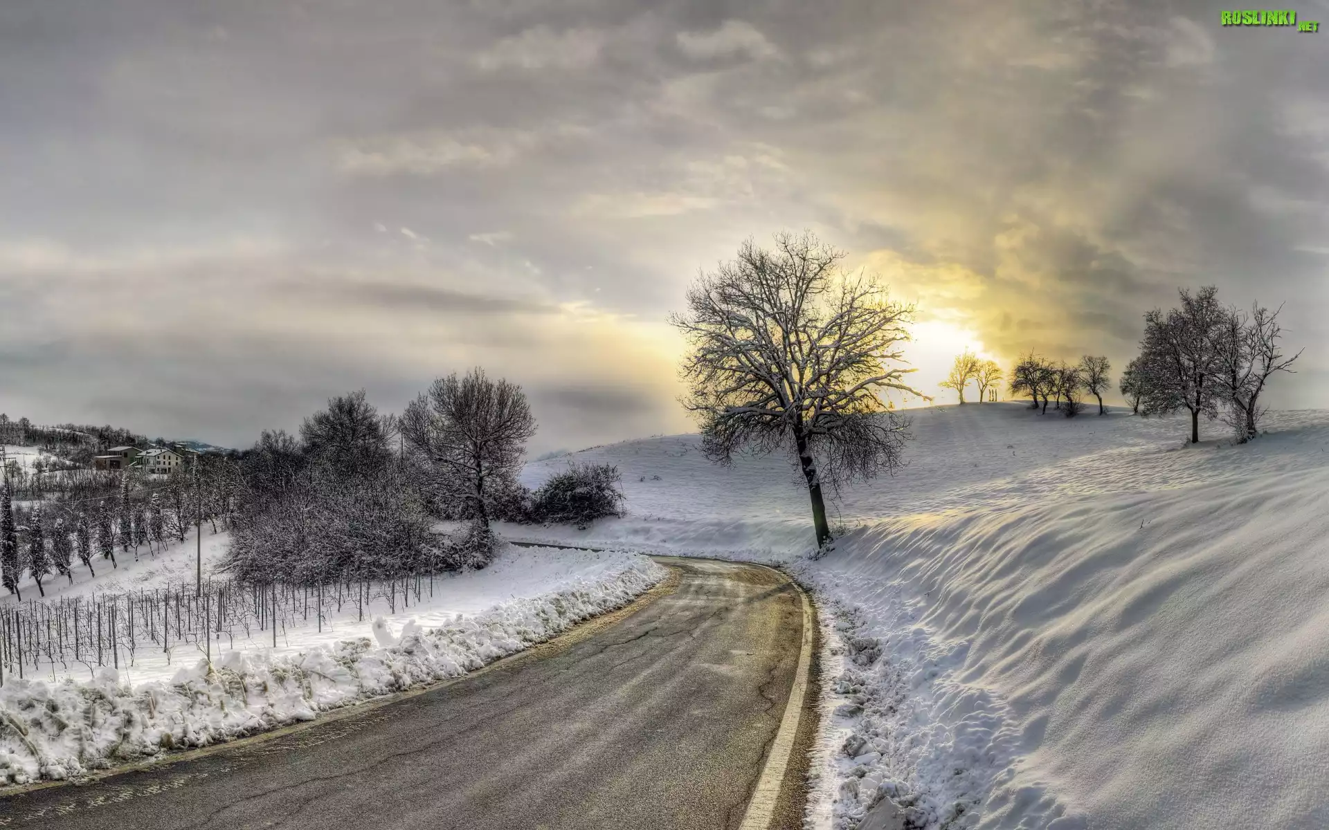 Rośliny: Zima, Droga, Drzewa, Wzgórze, Śnieg, Zachód słońca