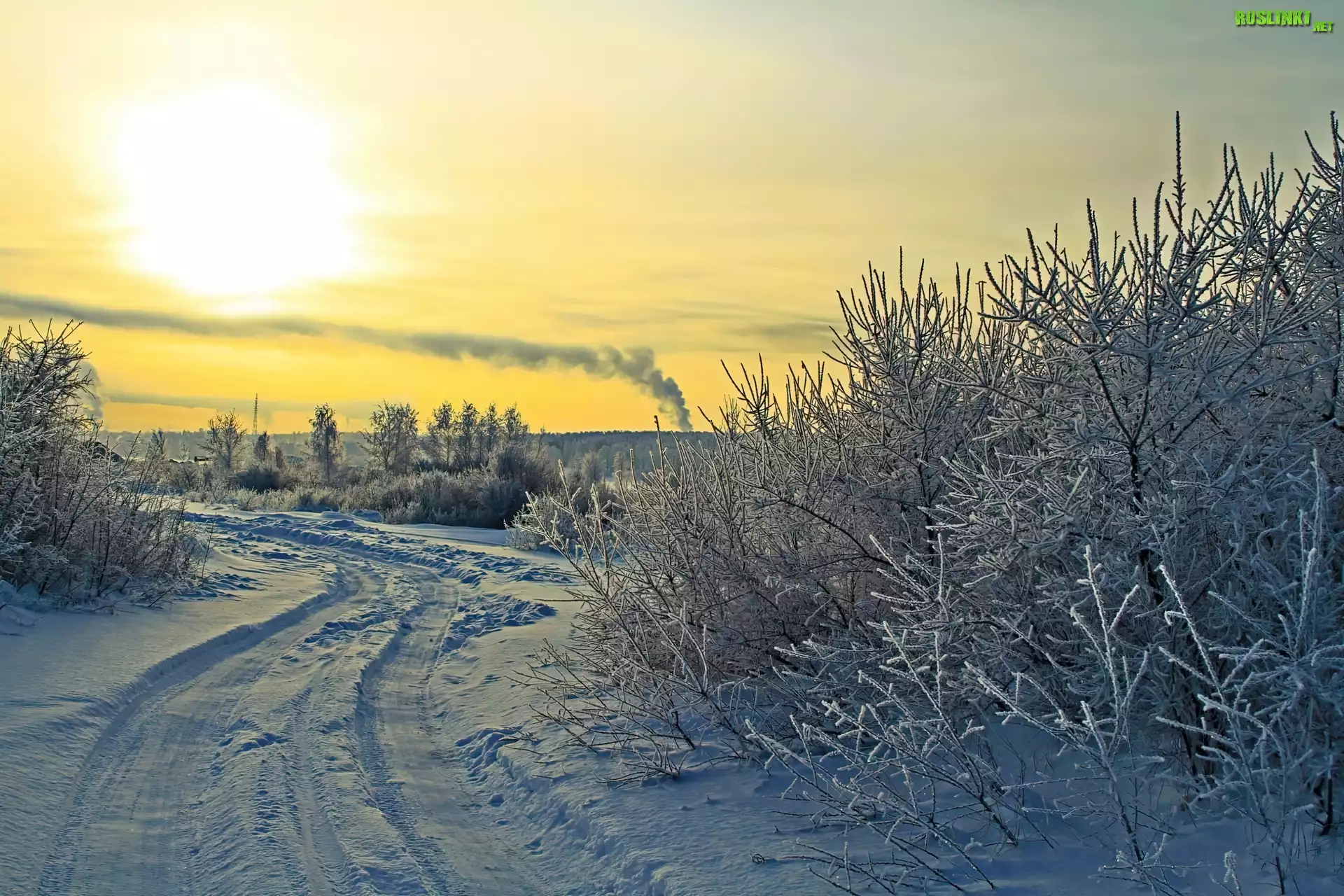 Rośliny: Zima, Dróżka, Oszronione, Drzewa, Krzewy, Wschód, Słońca