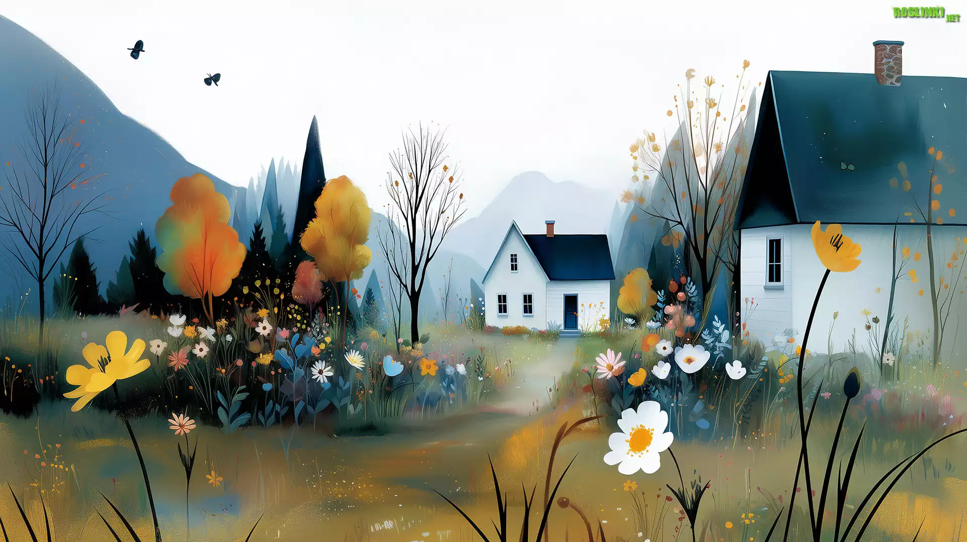 Rośliny: Białe, Domy, Kwiaty, Drzewa, Grafika, AI