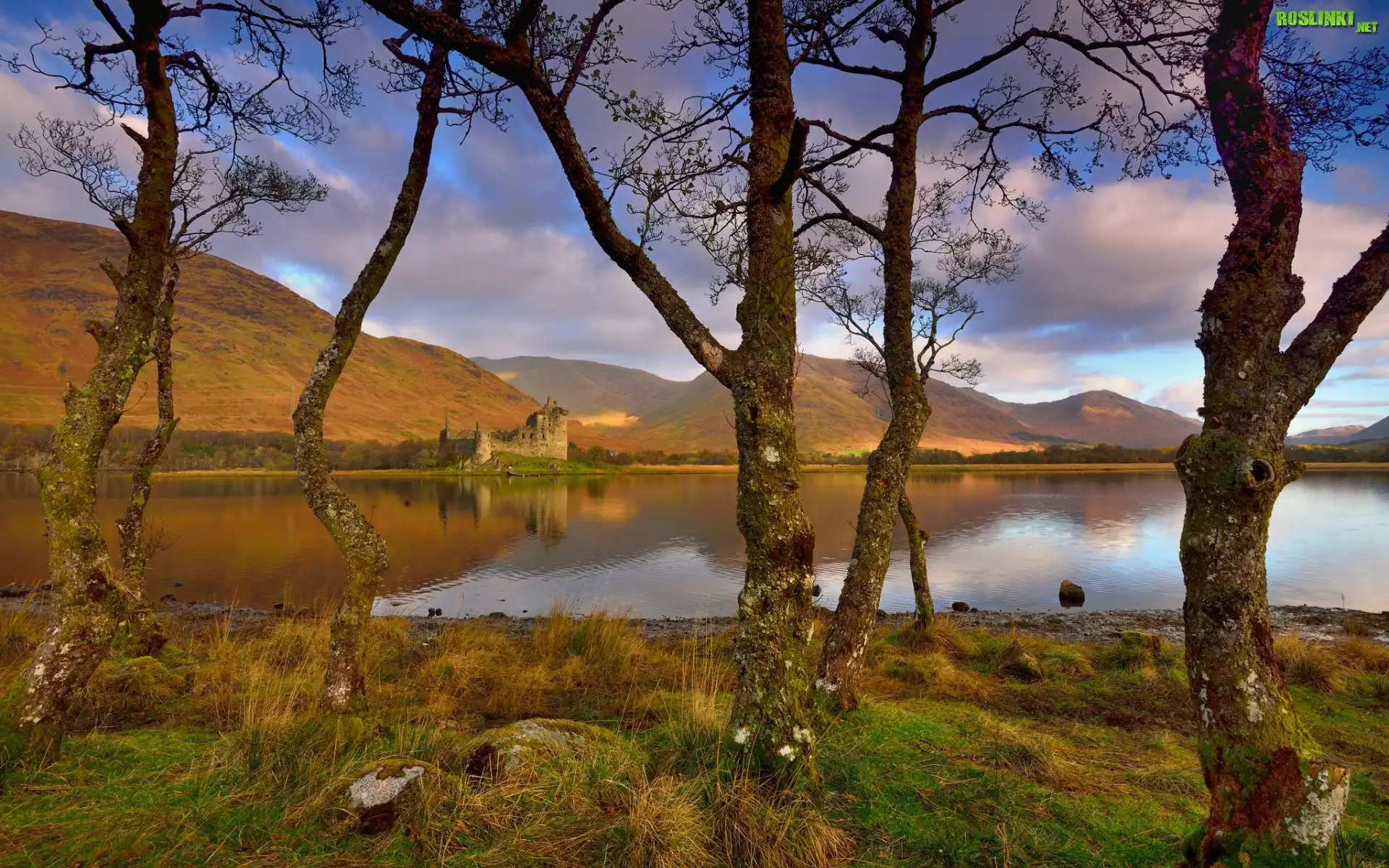 Drzewa, Gałęzie, Jezioro Awe, Ruiny, Zamek, Twierdza, Kilchurn Castle, Wzgórza, Niebo, Chmury, Szkocja |