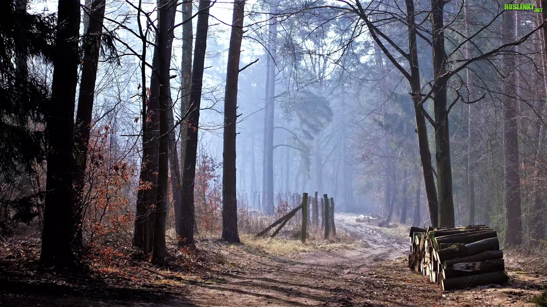 Rośliny: Las, Drzewa, Mgła, Poranek, Ogrodzenie, Droga, Ścięte, Bale