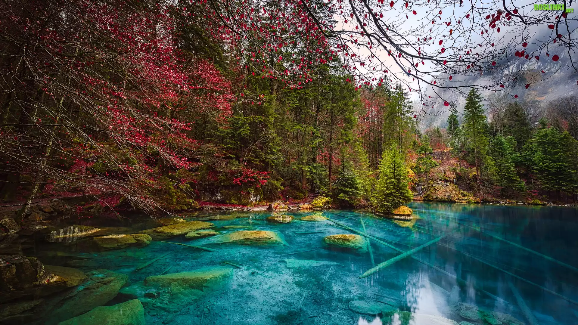 Rośliny: Szwajcaria, Kanton Berno, Jezioro Blausee, Kamienie, Jesień, Las, Drzewa