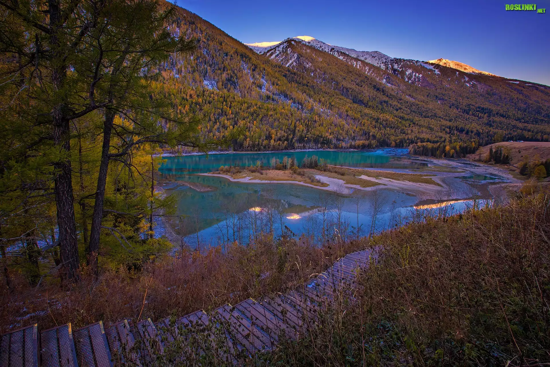 Rośliny: Chiny, Hrabstwo Xinjiang, Okręg Burqin, Jezioro, Kanas Lake, Góry, Drzewa