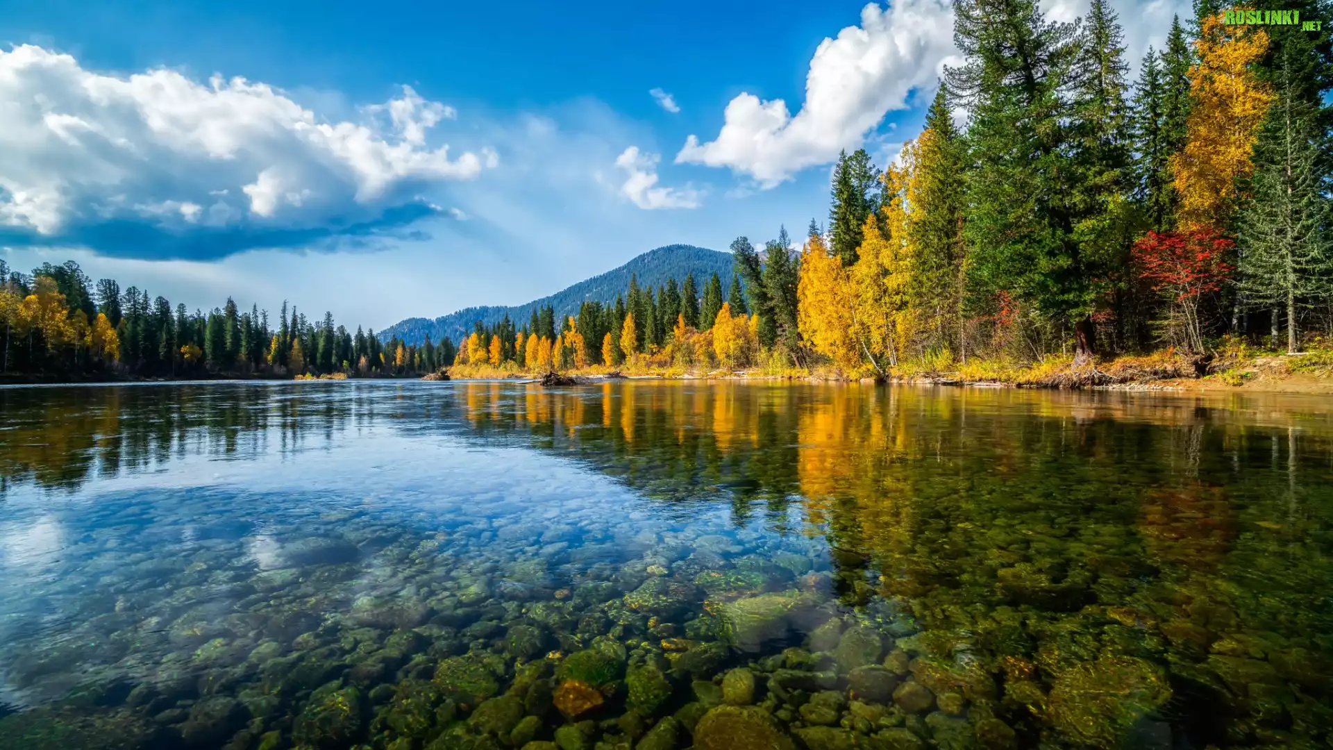 Rośliny: Jesień, Jezioro, Kamienie, Drzewa, Góry, Chmury